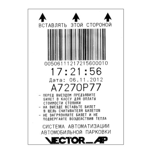 Билеты печатаются на бумаге плотностью 100-125 г/м2. Благодаря этому они не мнутся при хранении. В качестве карт могут использоваться бесконтактные proximity карты различных форматов. Для чтения уникального номера карты необходимо поднести ее к считывателю на расстояние 8-15 см. В системе могут использоваться карты различного функционального назначения: служебные, абонементные и т.п. Билет Парковочный Билет - это одноразовый бумажный документ, выдаваемый системой разовому посетителю при въезде. На нем нанесен уникальный номер, время и место въезда на парковку в виде штрих кода и текста. На билете также может быть нанесена краткая инструкция по пользованию парковкой, тарифы и другая служебная информация. Абонементная карта Карта, которой задается определенный срок действия.