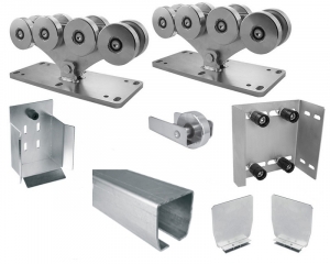 Состав набора комплектующих для откатных (сдвижных) ворот: Скоба направляющая верхняя с 4 роликами, 0-124 мм, для откатных (сдвижных) ворот - 1 шт, Тележка с 8 роликами "L", до 1700кг, для откатных (сдвижных) ворот - 2 шт, Направляющая "L" 6м балка (ши...