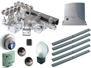 Состав набора комплектующих для откатных (сдвижных) ворот: Опора (каретка) роликовая ЭКО для откатных (сдвижных) ворот - 2 шт, Направляющая ЭКО 6м балка (шина, профиль) для откатных (сдвижных) ворот - 1 шт, Ролик концевой съемный ЭКО для откатных (сдвижных) ворот - 1 шт, Ловитель нижний роликовый ЭКО для откатных (сдвижных) ворот - 1 шт, Заглушка направляющей ЭКО для откатных (сдвижных) ворот - 1 шт, Ловитель верхний роликовый для откатных (сдвижных) ворот - 1 шт, Ролик нейлоновый с набором крепежа «стандарт» для откатных (сдвижных) ворот - 2 шт, Кронштейн с боковым креплением для откатных (сдвижных) ворот - 1 шт, Зубчатая рейка М4 DHRACK - 5 шт, Привод ROBUS 1000 электропривод для откатных (сдвижных) ворот, автоматика NICE - 1 шт, Приемник Nice Opera встраиваемый (разъем SM) OXI, динамический код. Память - 1024 кода. - 1 шт, Пульт ДУ Nice OPERA 2к с динамическим кодом, для ворот и шлагбаумов - 1 шт, Лампа сигнальная LUCYB, оранжевая, 12В, 21Вт (со встроенной антенной, BlueBUS) - 1 шт, Фотоэлементы Slim BlueBus EPSB - 1 шт.