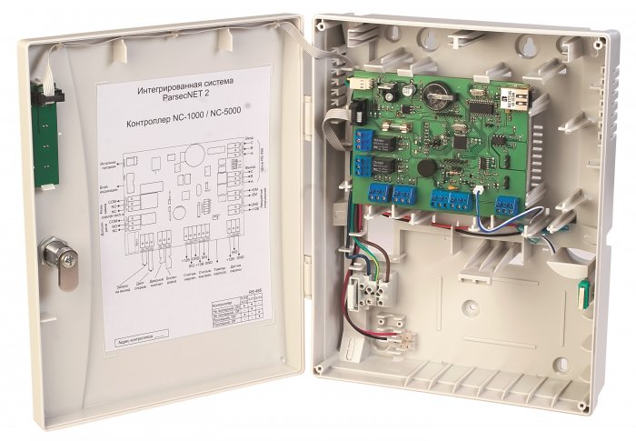 Контроллеры Parsec NC-2000-IP поставляются в пластиковом корпусе со встроенным источником питания, который обеспечивает как питание электроники контроллера, так и питание замков и охранных датчиков (при условии, что суммарный ток потребления замка не превышает возможностей блока питания).